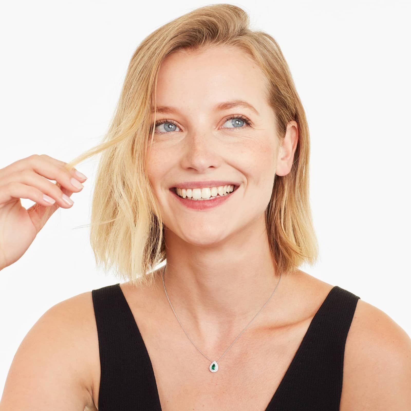Exquisite and captivating, this Pear-Shaped Emerald Double Diamond Halo Necklace embodies timeless luxury and elegance. The centerpiece features a vivid pear-shaped emerald, renowned for its rich green hue that symbolizes renewal, love, and prosperity. Surrounding the emerald is a dazzling double halo of brilliant diamonds, amplifying its radiance and creating a breathtaking play of light. Expertly crafted in 18K white gold, the pendant is paired with an 18-inch adjustable cable chain featuring a lobster claw clasp and silicone bead for a perfect fit. Whether worn for a special occasion or to elevate your everyday style, this necklace makes a statement of pure sophistication.