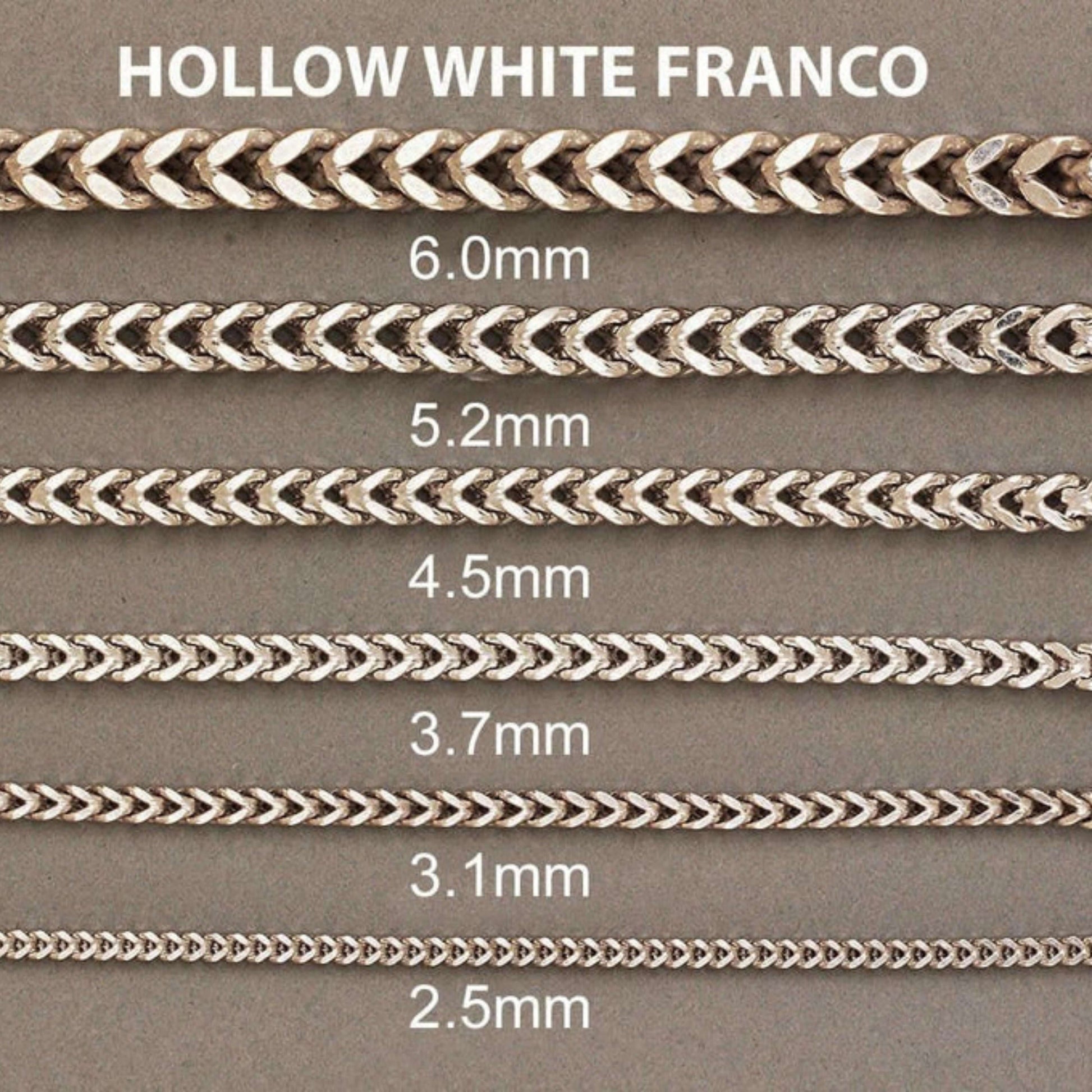 Find your perfect hollow Franco chain width for any occasion. Choose a finer 2mm chain for subtle elegance or a bolder 5.5mm for a more noticeable style. Comfortable for all-day wear, these chains are ideal for solo wear, pendants, or layering. Hollow white gold offers a luxurious appearance at an exceptional value.
