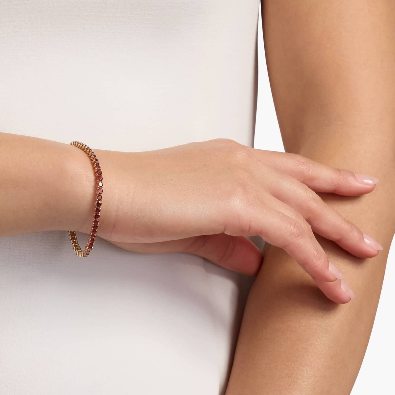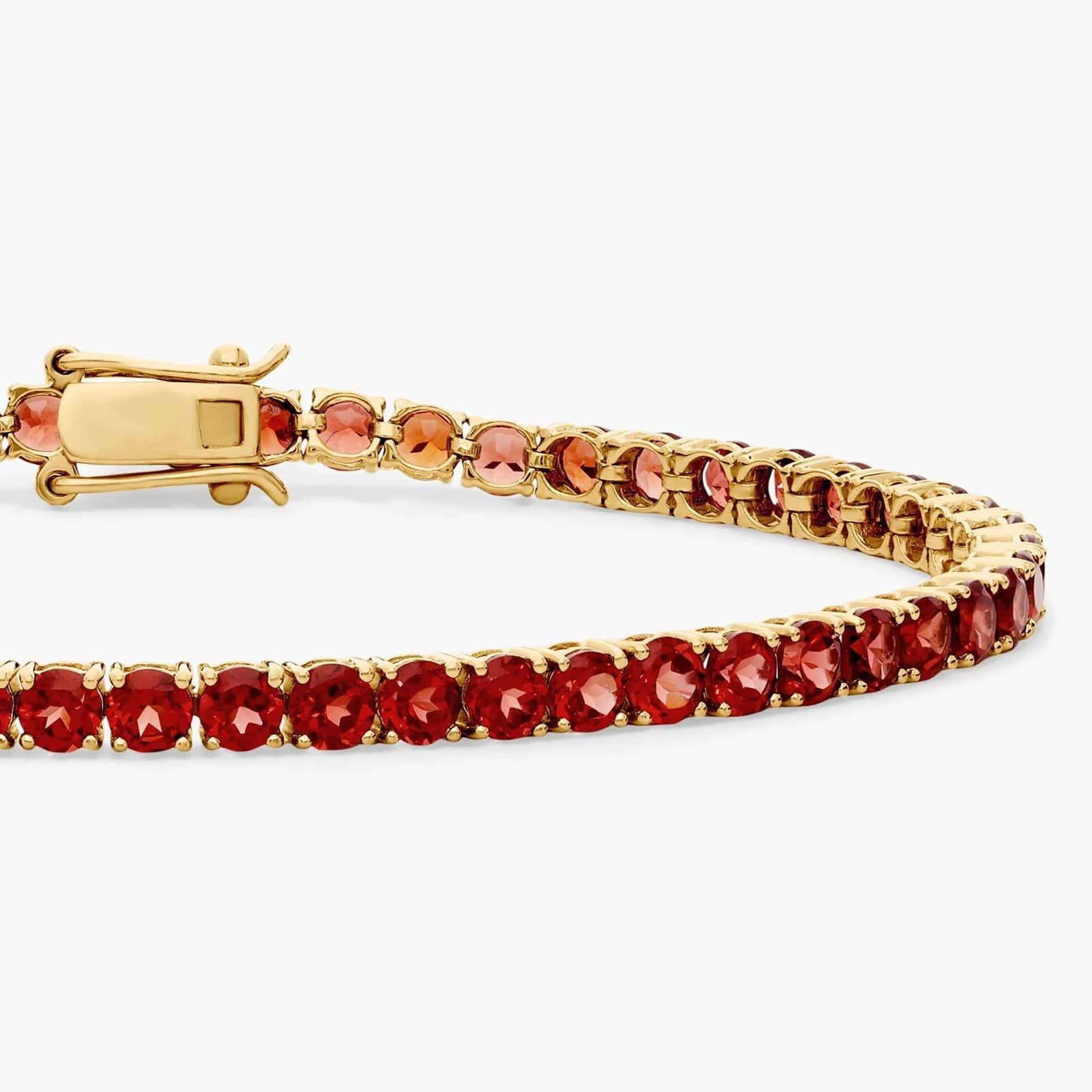 Timeless and radiant, this Garnet Tennis Bracelet showcases a full circle of richly colored garnet gemstones that sparkle with every movement. Set in luminous 14K yellow gold, each stone is meticulously placed to create a seamless flow of brilliance and warmth. Whether worn solo for a refined statement or stacked with other bracelets for a modern layered look, this piece adds a touch of sophistication to any style. Designed for both beauty and comfort, it features a secure box clasp to ensure an elegant fit all day long.