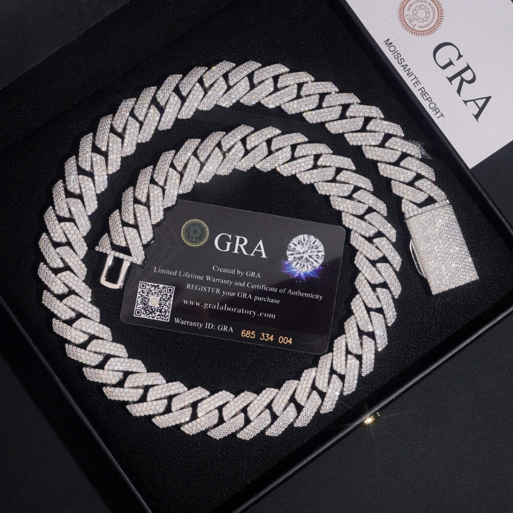 The 20mm Moissanite Cuban Link Chain (3 Rows) in 925 Sterling Silver is the ultimate blend of bold design and luxurious craftsmanship. Featuring a striking 20mm Cuban link design, this chain is meticulously adorned with radiant moissanite stones, offering brilliance that rivals diamonds. Crafted from premium 925 sterling silver, it is polished to perfection for a sleek, mirror-like finish that exudes sophistication.
