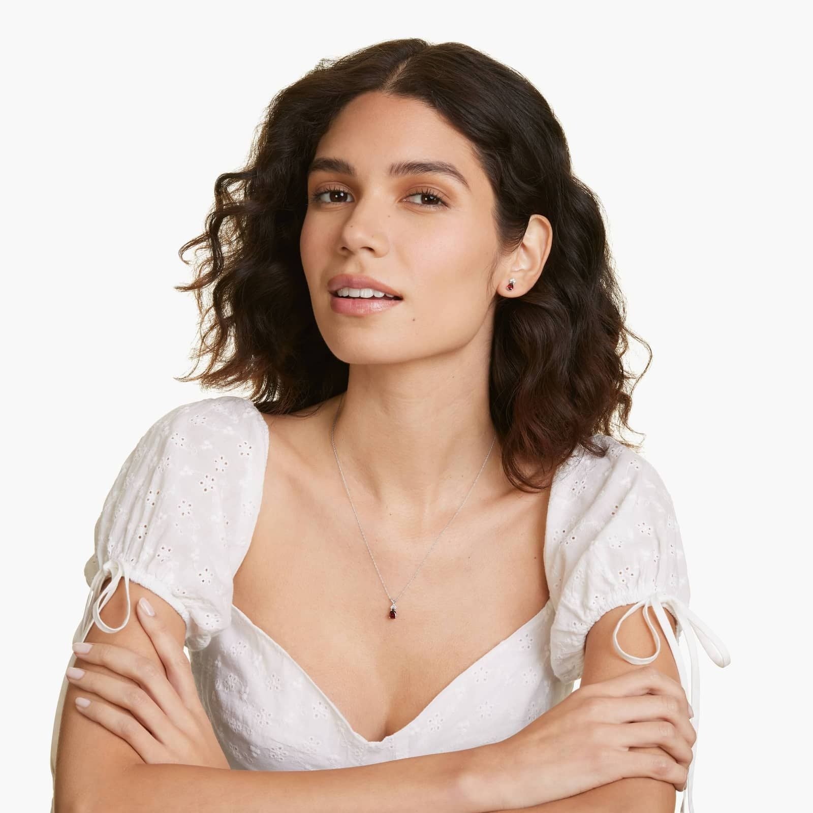 • Gemstone: Pear-Shaped Garnet (January Birthstone) with Tri-Diamond Accent