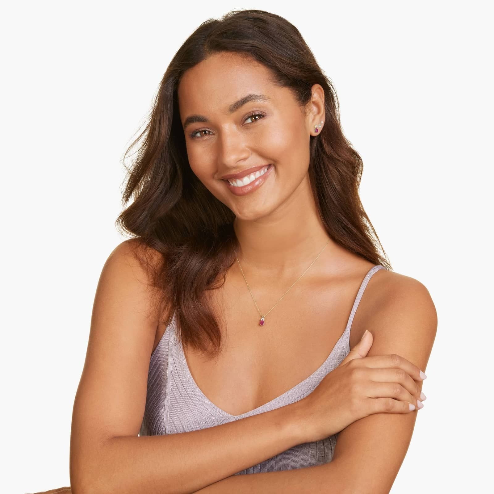 • Gemstone: Pear-Shaped Ruby (July Birthstone) with Tri-Diamond Accents