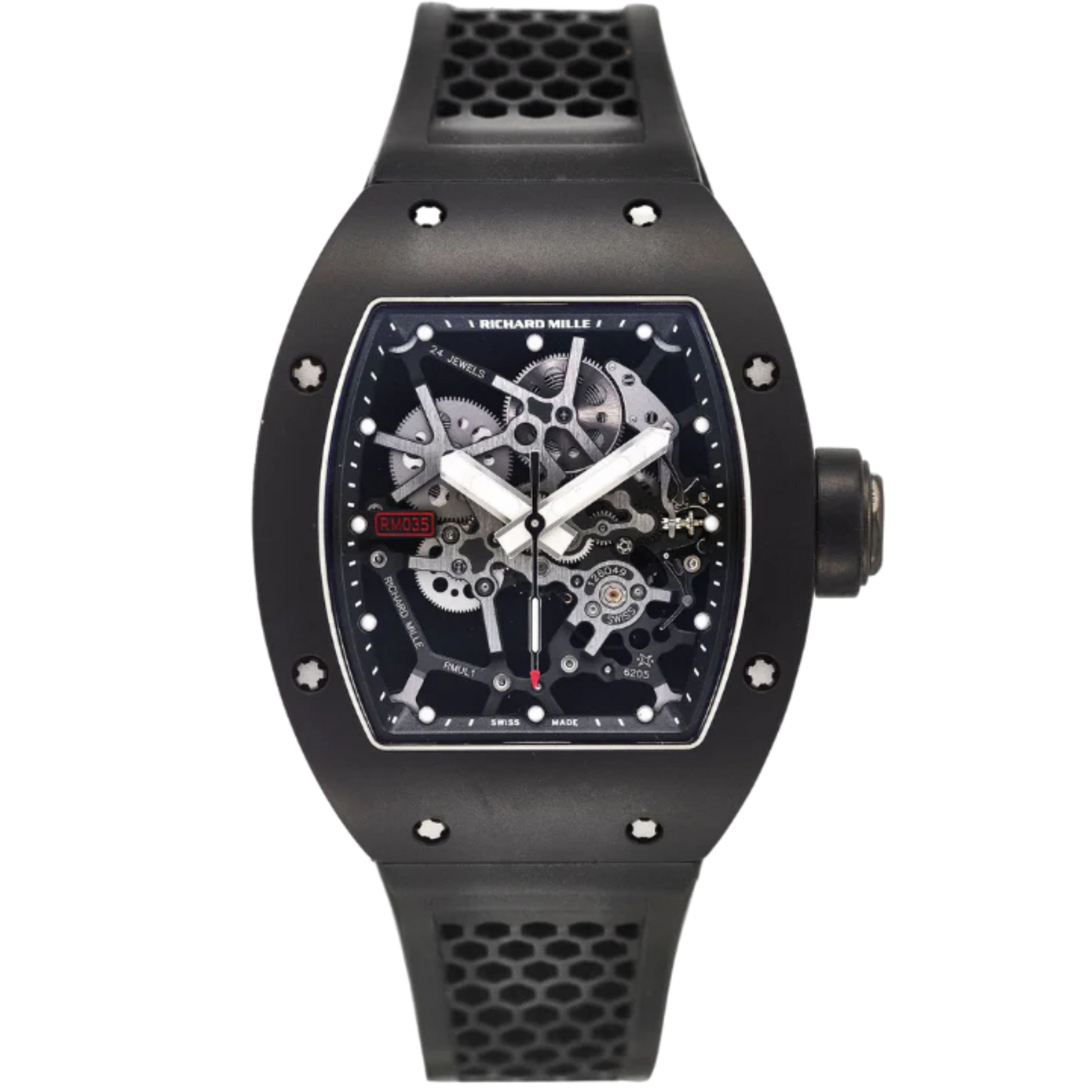 Richard Mille RM 035 AL ALMG Rafael Nadal 40mm Aluminium black case, transparent sapphire dial, solid aluminium case back, manual winding movement, black rubber/polyurethane strap with Richard Mille folding clasp.