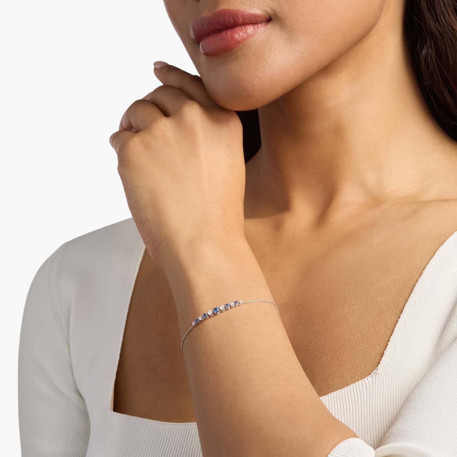 Graceful and luminous, this Sapphire and Diamond Graduated Curve Bracelet brings refined sparkle and color to your wrist. Crafted in 14K white gold with a radiant rhodium finish, this bracelet features a graduated line of prong-set sapphires and diamonds arranged in a gentle curve for a sophisticated touch. The deep blue sapphires—September’s birthstone—symbolize wisdom and loyalty, while the brilliant diamonds add timeless brilliance and contrast. Attached to a delicate adjustable cable chain and secured with a lobster claw clasp, this bracelet transitions effortlessly from day to night, offering versatility and understated luxury.